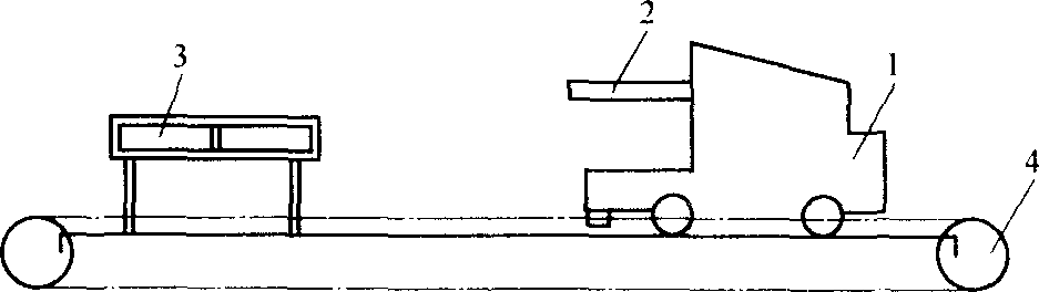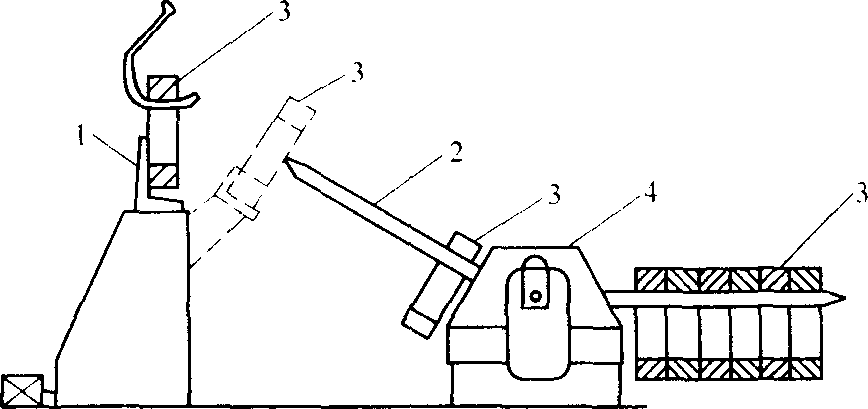 圖1-2 用卸卷小車的盤卷卸卷裝置示意圖 1,卸卷小車 2,升降橫桿 3,固定收集架 4,鏈條傳動機構(gòu)