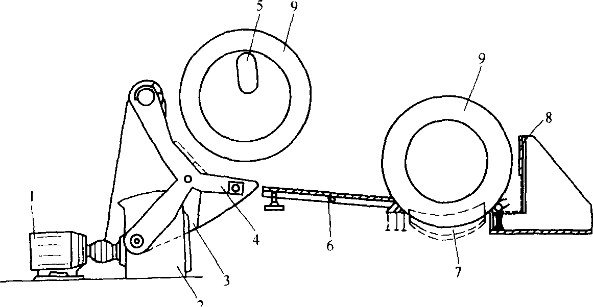 圖1-3用C型鉤卸盤卷的卸卷裝置示意圖 1,電機 2,渦輪減速機 3,曲柄機構(gòu) 4,托卷板 5,形鉤 6,銜接鋼板 7,步進梁 8,固定擋板 9,盤卷