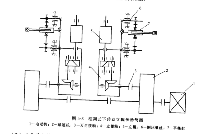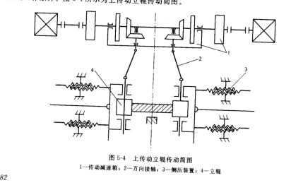 上傳動的立輥是指主傳動裝置放在上面,用萬向接軸傳動立輥。采用上傳動可改善傳動裝置的工作條件。圖5-4所示為上傳動立輥傳動簡圖。