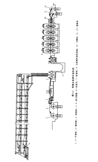 自 1979年開(kāi)始,出現(xiàn)了全連續(xù)冷連軋機(jī),如圖6-2 所示。這種軋機(jī)只要****次引料穿帶后,就可實(shí)現(xiàn)連續(xù)軋制。 后續(xù)帶卷的頭部通過(guò)焊接機(jī)與前一帶卷尾部焊接在一起,軋成后用飛剪機(jī)分卷。并由兩臺(tái)卷取機(jī)交替卷取帶鋼。 全連續(xù)冷連軋,機(jī)即使在換輥時(shí)。帶鋼依然停留在軋機(jī)內(nèi),換輥后可立即進(jìn)行軋制。采用全連續(xù)冷連軋機(jī),可以提高生產(chǎn)率 30%~50%,產(chǎn)品質(zhì)量和收得率也都得到提高。