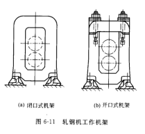 軋鋼機機架是工作機座的重要部件,軋輥軸承座及軋輥調(diào)整裝置等都安裝在機架上。機架要承受軋制力,必須有足夠的強度和剛度。機架的主要型式有開 口式和閉口式兩種, 如圖6-11所示。閉口式機架包括左、右立柱及上、下橫梁的一整體鑄件,其優(yōu)點是具有較好的強度與剛度。常用于軋制壓力較大或?qū)埣叽缫筝^嚴(yán)格的軋機上,如初軋機、鋼板軋機和冷軋機。這種型式的機架,換輥不方便,換輾時,軋輾是沿其軸線方向從機架窗口中抽出或裝入,這種軋機一般都設(shè)有專用的換輾裝置。開口式機架由機架底座與可裝拆的上橫梁組成。