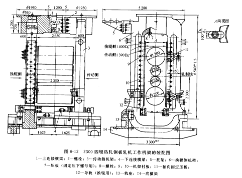 圖 6-12 所示為 2300四輾熱軋鋼板軋機工作機架的裝配圖。它是由左右兩閉口式機架3、6,一個具有上支承輾平衡液壓缸孔的上連接橫梁1,兩個下連接橫梁 4,兩個放壓下傳動裝置的托架 5及兩個軌座 13等主要零件所組成。