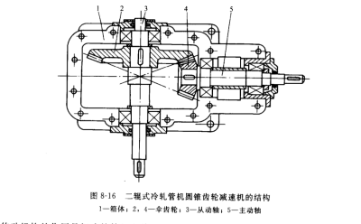 主傳動(dòng)的減速機(jī)有圓錐齒輪減速機(jī)和圓錐-圓柱齒輪減速機(jī)。用圓錐齒輪減速機(jī)的優(yōu)點(diǎn)是∶主傳動(dòng)可布置成與軋制線平行,以減小機(jī)列的寬度。圓錐齒輪減速機(jī)的結(jié)構(gòu)如圖 8-16 所示,在箱體1中安裝著2或3個(gè)裝在主動(dòng)軸5和從動(dòng)軸上的傘齒輪。