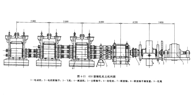 圖4-15所示為650型鋼軋機主機列圖,電動機1的運動和力矩通過電動機連軸節(jié)2,減速機4,朱連軸節(jié)5,齒輪座6和連接軸7傳遞給軋輥9,在此傳動中設(shè)置了飛輪3及聯(lián)軸節(jié)平衡裝置8.