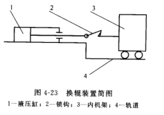 換輥裝置見(jiàn)圖如圖4-23所示,主要由液壓缸1,鎖鉤2,內(nèi)機(jī)架3及輥道4組成。