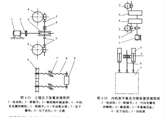 立棍壓下裝置原理如圖4-21所示。主要由電動(dòng)機(jī)1,聯(lián)軸器2,兩級(jí)洛倫桿減3和4,壓下螺母7,壓下絲杠8及手動(dòng)離合器6等部件組成。壓下裝置工作原理與其他軋機(jī)壓下裝置基本相同,有兩套壓下裝置,分別驅(qū)動(dòng)2個(gè)立棍。