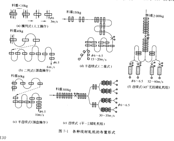 20世紀 50年代發(fā)展了半連續(xù)式線材軋機。粗軋機組布置成連續(xù)式,精軋機組布置成橫列式,中軋機組布置成連續(xù)式或橫列式。在機械化程度較高的半連續(xù)線材車間中,可以不用人工喂鋼,成品較高軋制速度可達16m/s,單重達到 200kg,年產量可達到 20 萬~35萬噸。半連續(xù)式線材軋機的布置形式如圖7-1(c)、(d)所示。